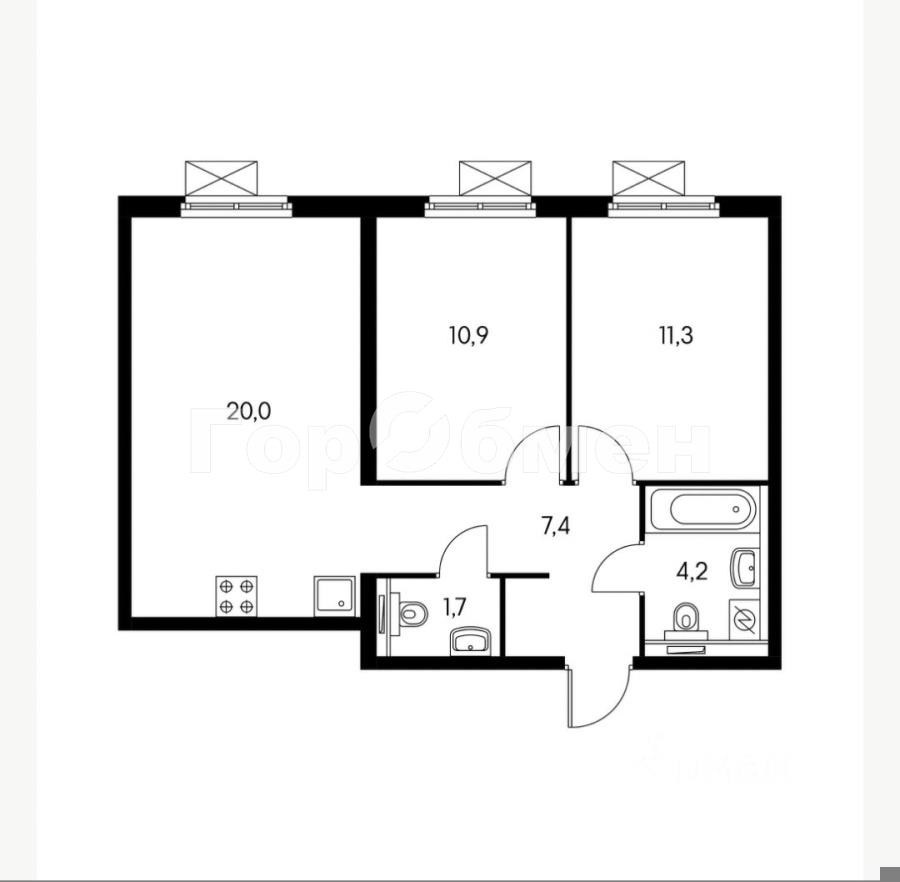 Планировка включает в себя две изолированные комнаты 11,3/10,9 м2, просторную кухню-гостиную 20 м2, два санузла и просторный холл . Кухонный гарнитур со встроенной бытовой техникой: варочная панель, вытяжка, духовой шкаф, посудомоечная машина.