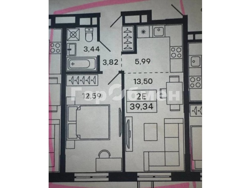 общая 39,4 м2, жилая 20 м2, кухни 13 м2 |